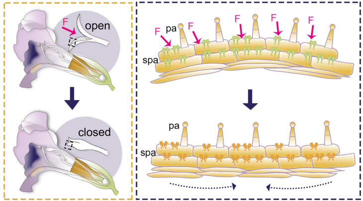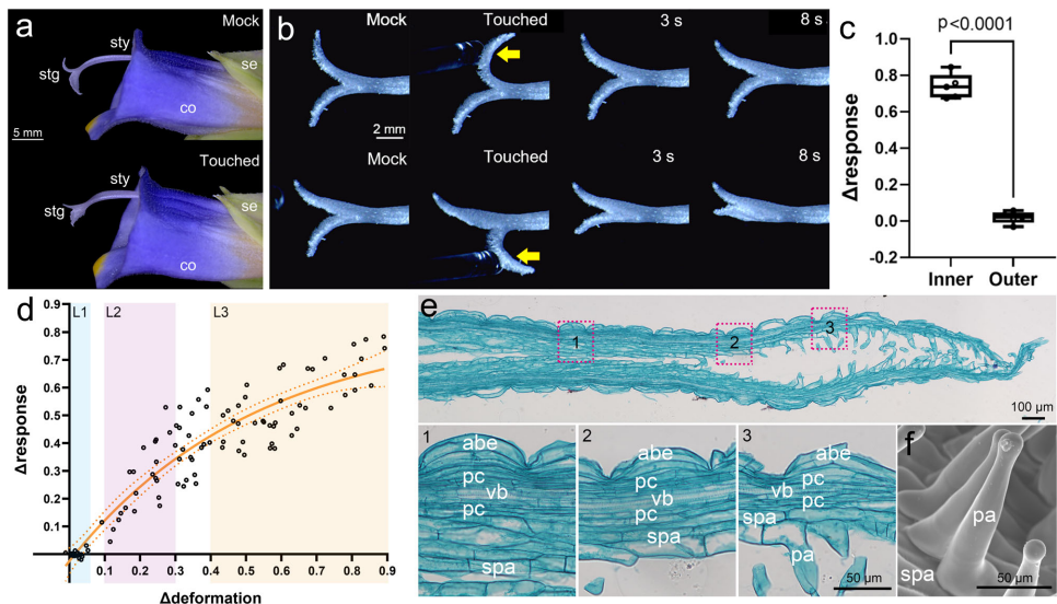 柱头仅内侧面对机械刺激敏感,刺激强度与运动程度呈正相关(图1d)。组织学显示柱头由乳突细胞(papilla cells)、亚乳突细胞(subpapillar cells)等分层构成:
