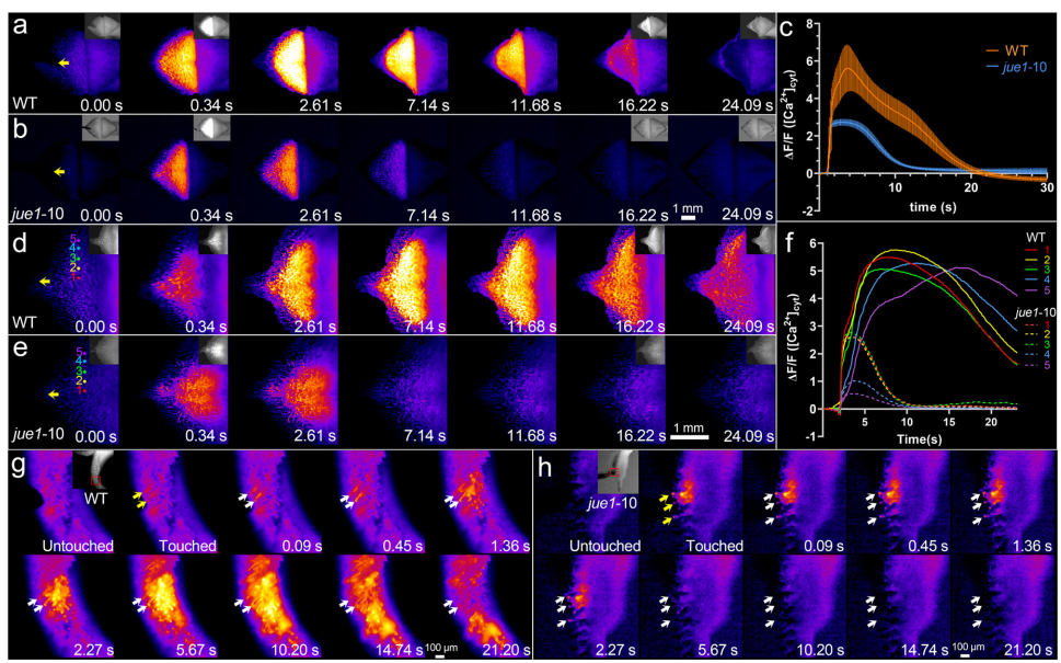 jue1突变体中,触刺激发的[Ca2+]cyt仅局限在刺激位点,无法向邻近细胞传播(图6)。单细胞刺激显示,野生型钙波可从乳突细胞扩散至亚乳突细胞,而突变体信号传导中断: