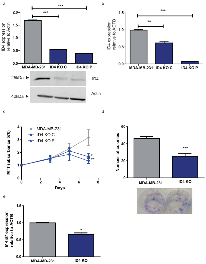 体外模型:ID4-KO细胞增殖率降低60%(MTT检测,p<0.001),克隆形成能力下降75%(图1c,d)