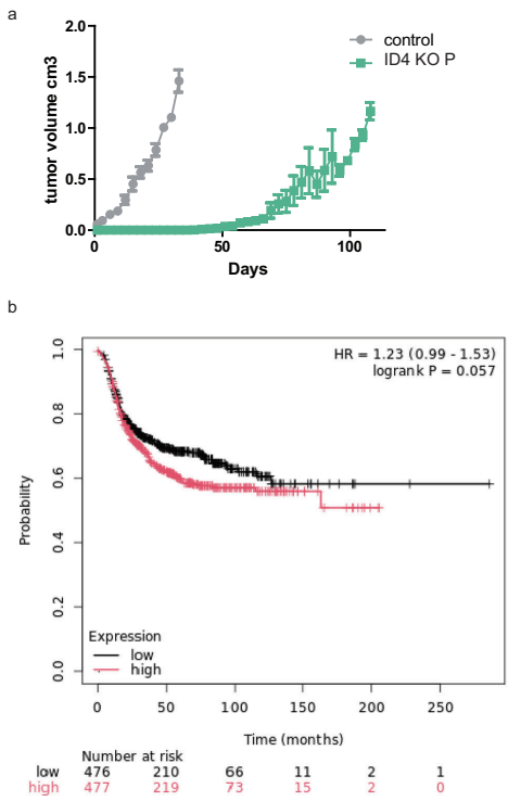 体内验证:NSG小鼠移植ID4-KO细胞后,肿瘤出现延迟60天,终体积仅为对照组的1/3(图2a左)