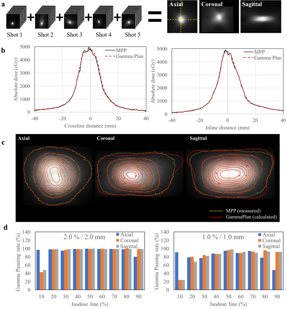 通过16 mm准直器测试表明,CCD与胶片的半高宽(FWHM)差异仅0.2 mm(21.6 vs 21.4 mm),剂量响应曲线R2达0.9988。校准后的MPP系统在10 Gy范围内显示出与胶片剂量计的高度一致性。
