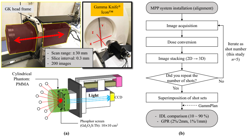 韩国江原大学医院放射肿瘤科与首尔峨山医学中心的研究团队在《Scientific Reports》发表创新成果,提出基于移动磷光探针(MPP)的三维QA解决方案。该系统通过圆柱形PMMA模体整合Gd2O2S:Tb磷光屏和1200万像素CCD相机,以0.3 mm层厚采集±30 mm范围内的二维剂量图像,经查表法转换为三维剂量分布。关键技术包括:建立CCD光学密度与EBT3胶片剂量的校准曲线;开发多靶点剂量叠加算法;采用γ分析(2%/2 mm和1%/1 mm标准)进行三维验证。
