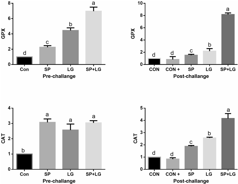攻毒后联用组死亡率仅6.7%,显著低于对照组的66.7%。血液分析显示LG+SP组维持了最高红细胞计数(2.34×106/μl)和血红蛋白(7.27 g/dl),同时白细胞中淋巴细胞比例提升至14.38×103/μl。基因表达分析揭示: