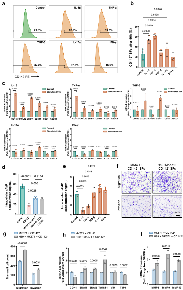 IL-1β和TNF-α可诱导CD142-SF向CD142+表型转化。ABCC4抑制剂MK571通过升高细胞内cAMP水平(2.5倍),激活PKA信号,使侵袭面积减少68%。H89(PKA抑制剂)可逆转该保护效应。