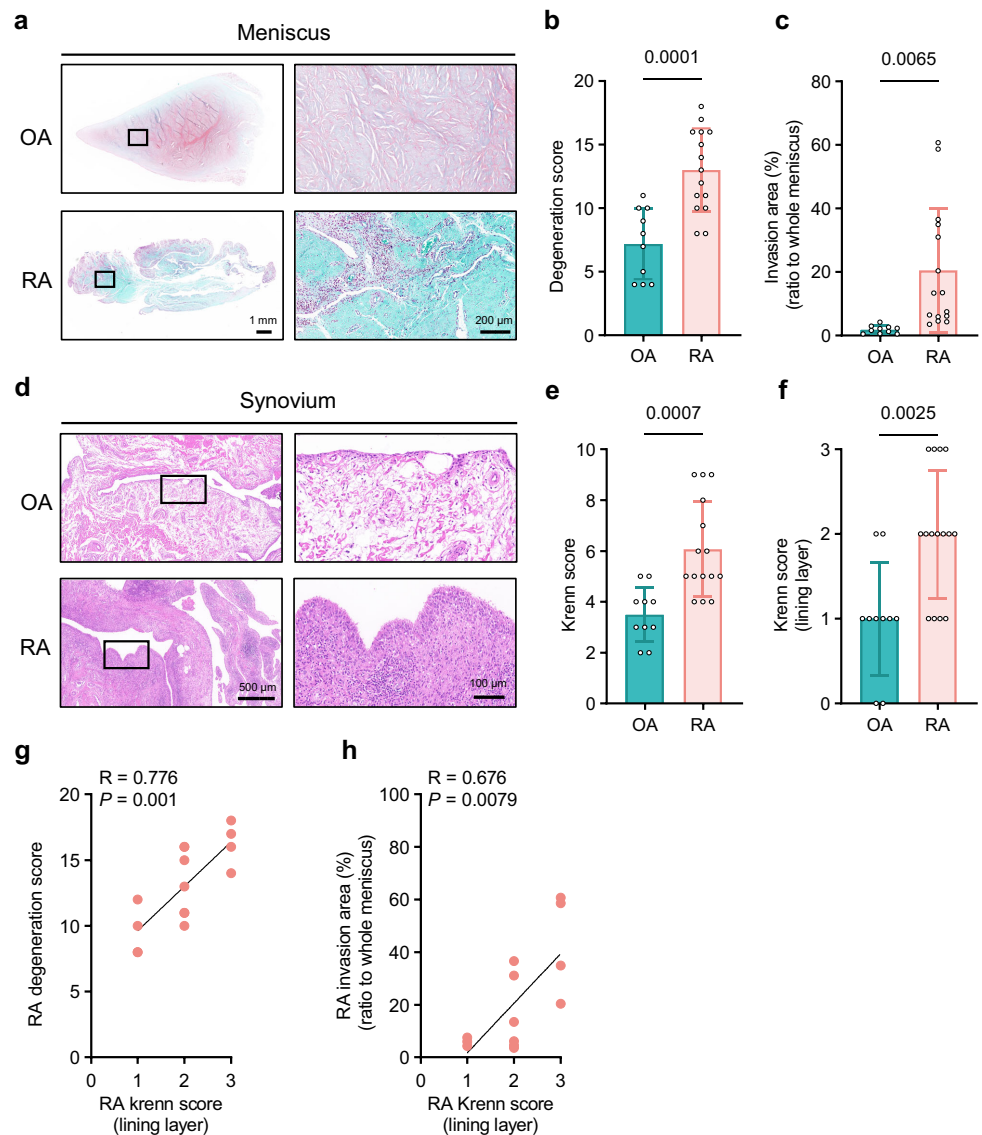 通过比较OA和RA患者的影像学与组织学特征,发现RA患者半月板体积减少50%以上,胶原纤维结构严重破坏,且侵袭面积与滑膜衬里层炎症评分(Krenn评分)呈正相关。