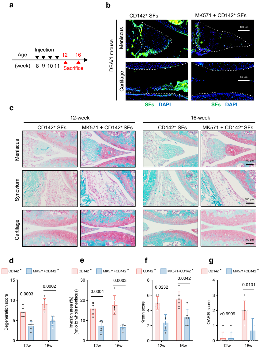 研究主要采用四项关键技术方法:1) 对RA膝关节置换术获取的滑膜、软骨和半月板组织进行单细胞RNA测序(scRNA-seq)分析细胞互作网络;2) 通过多色免疫组化(mlHC)结合空间定量分析CD142+SF分布特征;3) 建立DBA/1小鼠CD142+SF关节注射模型模拟半月板侵袭过程;4) 利用MK571阻断ABCC4功能并评估对半月板保护效应。研究队列包含17例长期随访的RA患者滑膜活检样本,通过KSS评分系统评估膝关节功能预后。