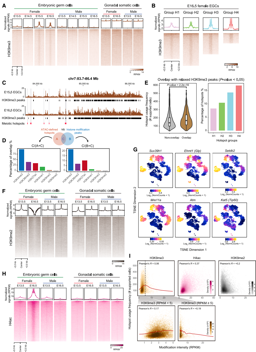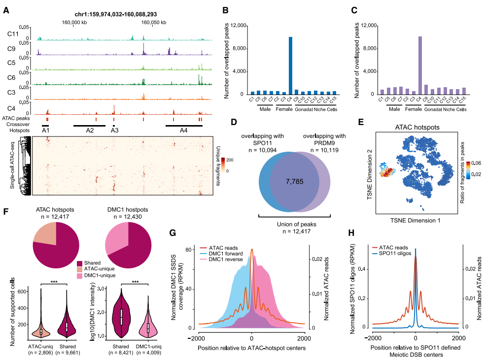 本研究针对雌性哺乳动物减数分裂重组热点调控机制不清的难题,通过单细胞ATAC-seq(scATAC-seq)和低输入量MNase-seq等技术,首次在单细胞水平揭示了雌性胚胎生殖细胞(EGCs)中重组热点使用频率的高度异质性,发现PRDM9介导的开放染色质与H3K4me3/H3K9me3双价态特征对热点活性的调控作用,为理解减数分裂性别二态性提供了新视角。