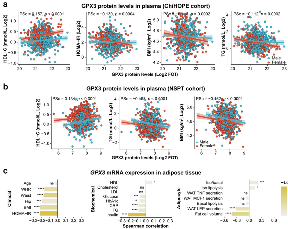 通过多队列关联分析发现,低GPX3水平与多种不良代谢特征相关:在ChiHOPE队列中,其与高胰岛素抵抗指数(HOMA-IR)、低高密度脂蛋白胆固醇(HDL-C)显著相关;在脂肪组织中,GPX3表达量与肥胖、炎症指标负相关。既往研究显示GPX3能增强胰岛素受体表达,并参与PPARγ介导的抗氧化作用,这可能是其预测价值的分子基础。