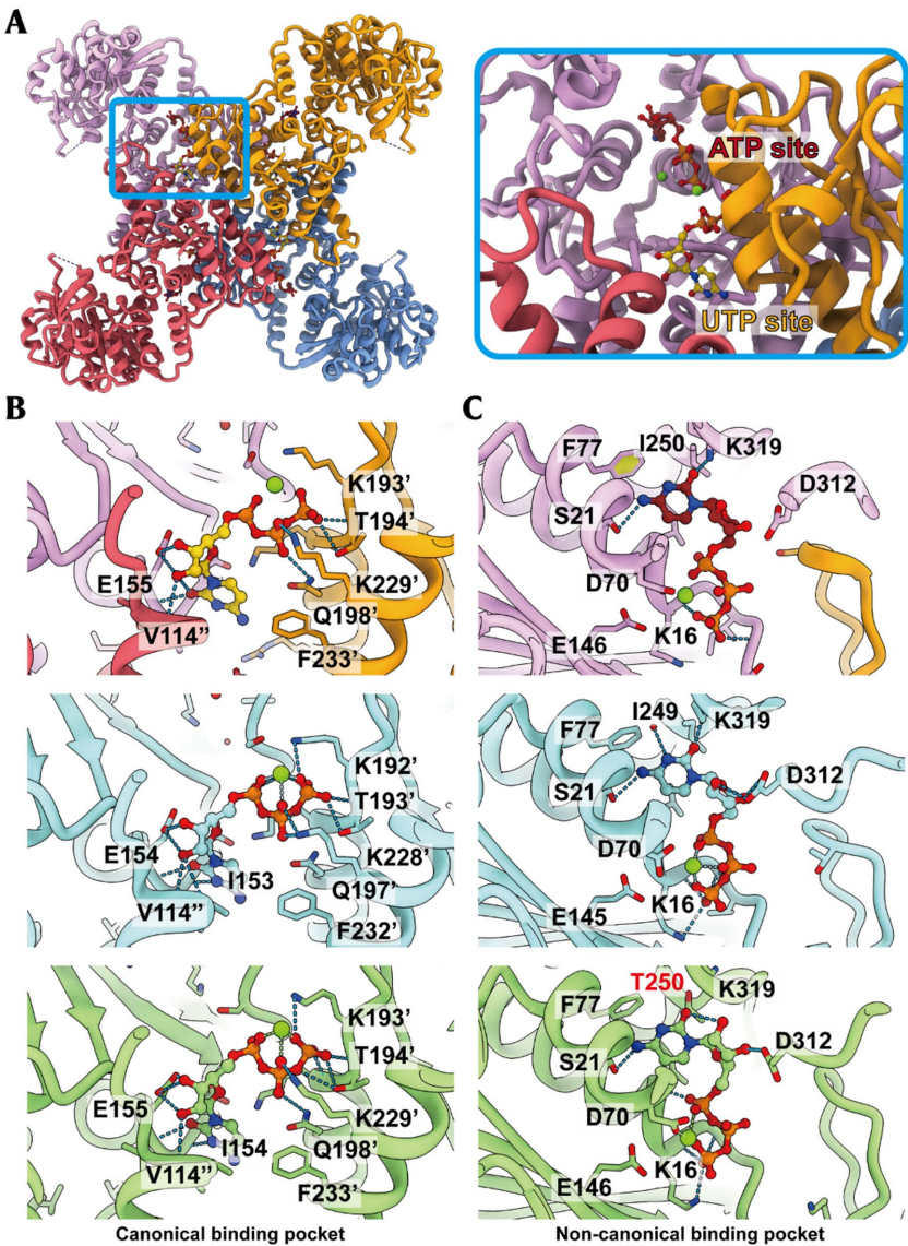 3.3 ?分辨率结构揭示,每个螺旋单元包含四个hCTPS1单体,沿轴向升高105 ?并旋转40°。两个独特的CTP结合位点被发现:典型位点(与UTP位点重叠)由E155通过盐桥稳定核糖基团;非典型位点(与ATP位点重叠)则通过S21/K319/F77网络固定胞嘧啶环。这种双位点结合模式在hCTPS2和果蝇CTPS(DmCTPS)中高度保守。