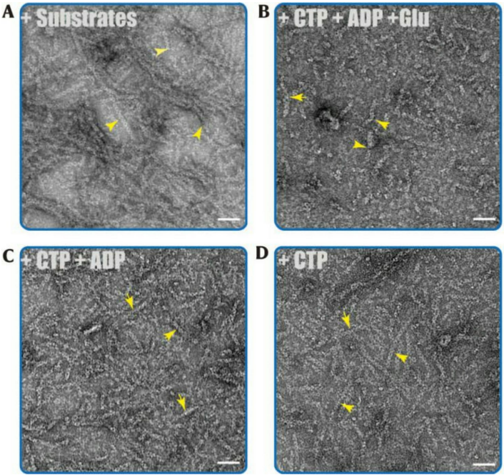 颠覆性发现来自配体筛选实验:传统认为导致丝状体解聚的CTP,实际上单独存在时就能诱导丝状形成。时间分辨实验显示,CTP加入后数秒内即可观察到丝状体,而ADP(二磷酸腺苷)也有类似效果,但谷氨酸无此功能。这直接挑战了"产物诱导解聚"的旧范式。