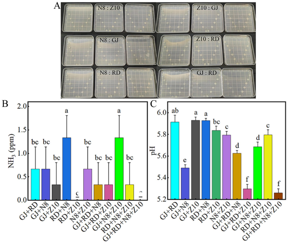 除臭微生物筛选:从8株候选菌中筛选出NH3减排率>90%的H6、N7、N8菌株,其中SynCom1(GJ+RD+N8+Z10)表现出最优的NH3减排(100%)和pH降低效果(4.6)。