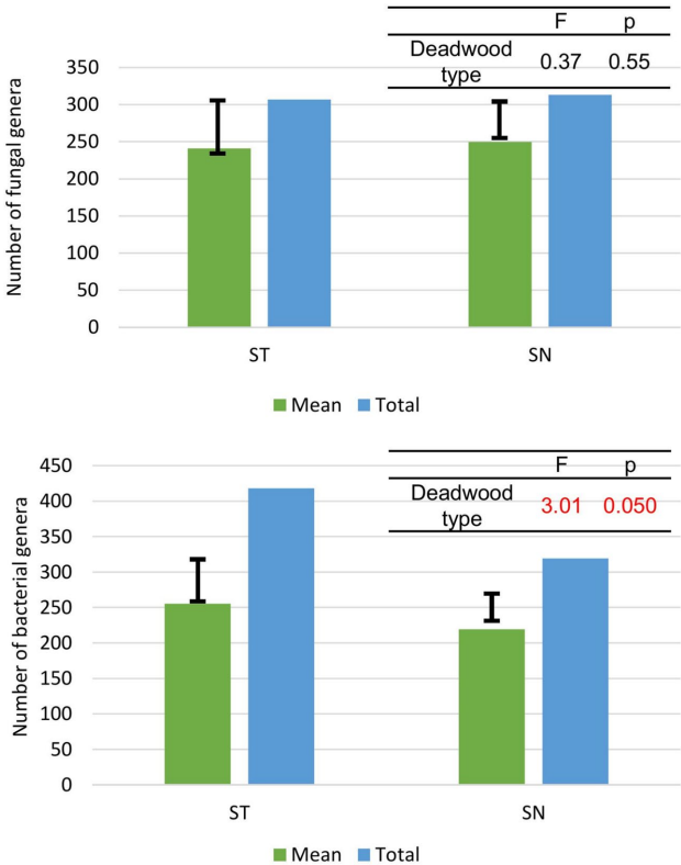 树桩展现出显著更高的氮(0.97% vs 0.58%)和磷(420.7 vs 217.4 mg/kg)含量,但碳含量更低(44.0% vs 49.3%)。这种差异源于树桩与土壤的直接接触,促进了养分交换。特别值得注意的是,树桩的碳氮比(C/N)显著低于枯立木(62.3 vs 107.6),这为后续微生物群落分异埋下伏笔。
