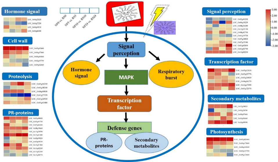 研究人员采用RNA干扰技术构建OsROS1a-RNAi(RS)株系,通过病斑长度测定确认其抗性增强。结合全基因组亚硫酸氢盐测序(WGBS)和转录组测序(RNA-seq),在接种Xoc后0/5/10/24小时四个时间点分析甲基化与基因表达变化。利用K-means聚类和KEGG通路分析解析关键调控网络。