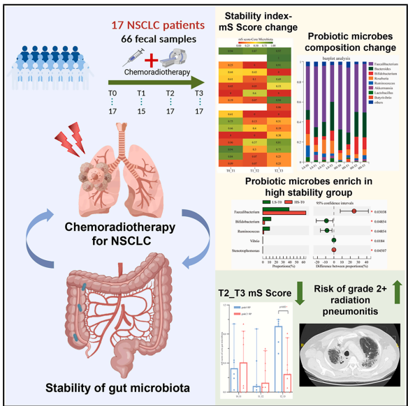本研究针对非小细胞肺癌(NSCLC)患者化疗放疗(CCRT)期间肠道菌群稳定性与放疗相关性肺炎(RP)的关联展开深入探索。研究人员通过μSTASIS算法量化纵向样本的微生物稳定性(mS评分),发现高稳定性菌群患者RP风险显著降低(p=0.035),并鉴定Faecalibacterium为关键预测菌属(p=0.040)。该研究为通过微生物干预降低放疗毒性提供了新靶点。