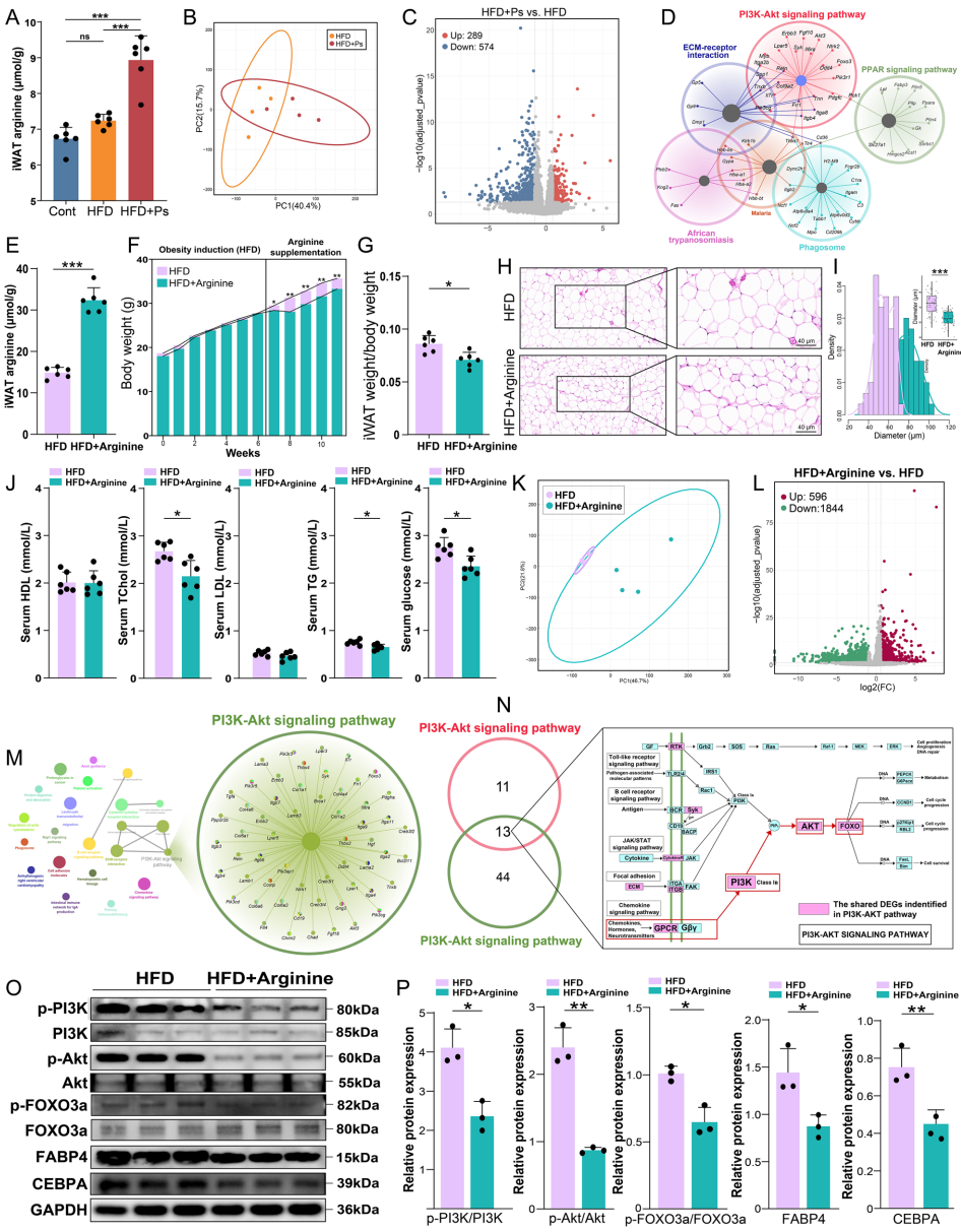 精氨酸干预实验显示,补充精氨酸可增加脂肪组织中精氨酸含量,抑制PI3K/Akt/FOXO3a信号通路活性,降低脂肪生成相关蛋白(FABP4和CEBPA)表达,最终减少脂肪沉积。