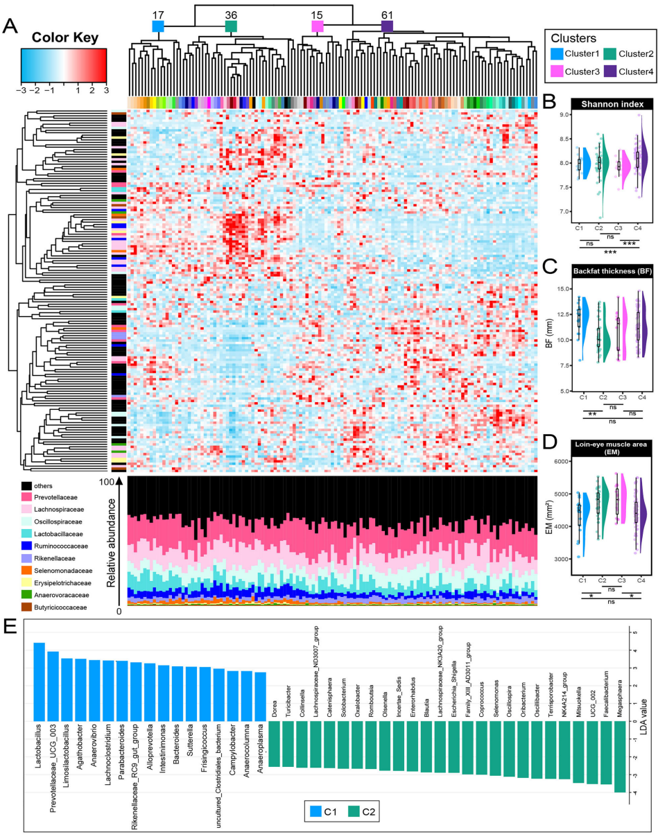 通过16S rRNA测序将猪群分为四个微生物群落簇,其中C2簇表现出较低的背膘厚度和较高的眼肌面积。菌群全关联分析显示P. succinatutens是与背膘厚度负相关最强的菌种。宏基因组分析进一步证实该菌在低背膘厚猪群中作为关键"驱动"菌存在。
