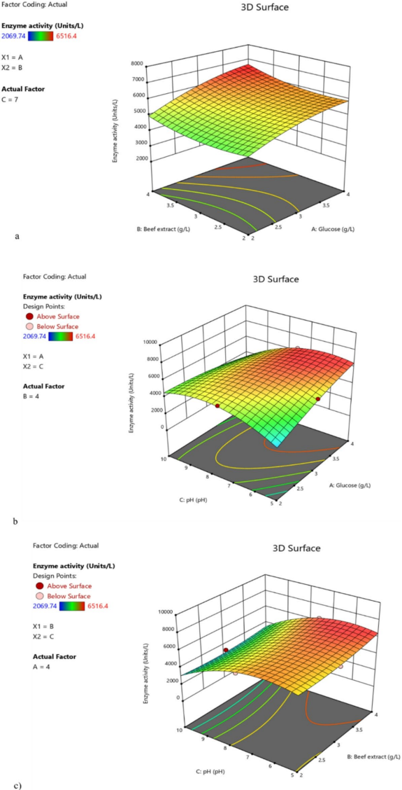 研究人员首先采用单因素优化(OFAT)确定关键参数:葡萄糖(最佳碳源,4022.6±0.9 U/mL)、牛肉浸膏(最佳氮源,4123.5±0.7 U/mL)、pH 7±0.3(3844.5±0.6 U/mL)和37℃(5230.6±1.2 U/mL)。随后通过响应面法(RSM)建立数学模型,发现葡萄糖(3 g/L)、牛肉浸膏(3 g/L)和pH 7.5的组合可使酶活达到6516.4 U/mL。在纯化工艺中,采用硫酸铵沉淀(20-80%饱和度)、透析和Sephadex G-100凝胶过滤三级纯化,最终获得比活30658 U/mg、纯度95倍的酶制剂。