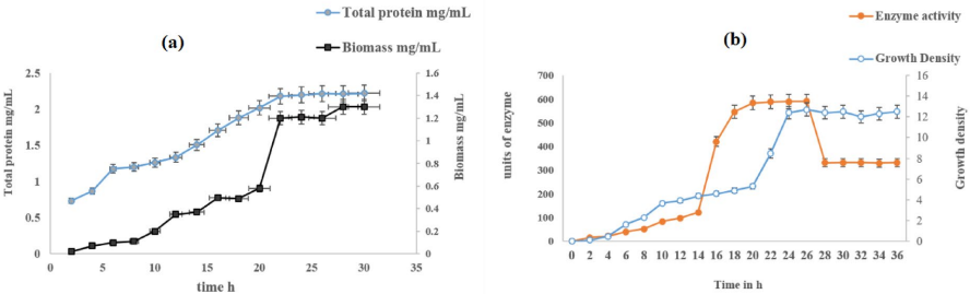 研究发现菌株VS56在26小时达到产酶高峰(591±1.1 U/mL),此时生物量为1.8±0.1 mg/mL,生长速率k=1.96 h-1。酶活与菌体生长呈正相关,表明该菌株具有快速产酶特性。