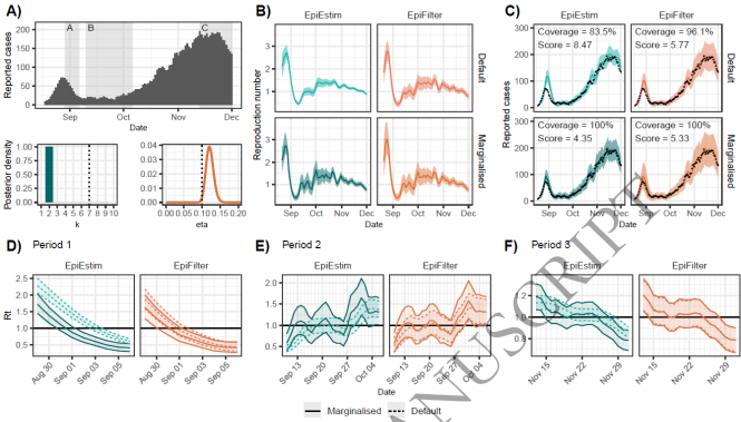 在三种典型疫情情景(随机游走、正弦波动、阶梯变化)的测试中,固定参数模型表现出系统性缺陷:默认EpiEstim在正弦波情景下95%置信区间覆盖率仅8.9%,边际化后提升至81.1%;而默认EpiFilter虽相对稳健(覆盖率81.1%),边际化仍可进一步提升至92.2%。