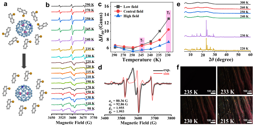 研究发现Y2@C79N在1-氯萘中呈现两个关键转变点:245K时信号强度达峰(对应熔点),230K出现轴对称EPR信号(对应结晶起始)。通过