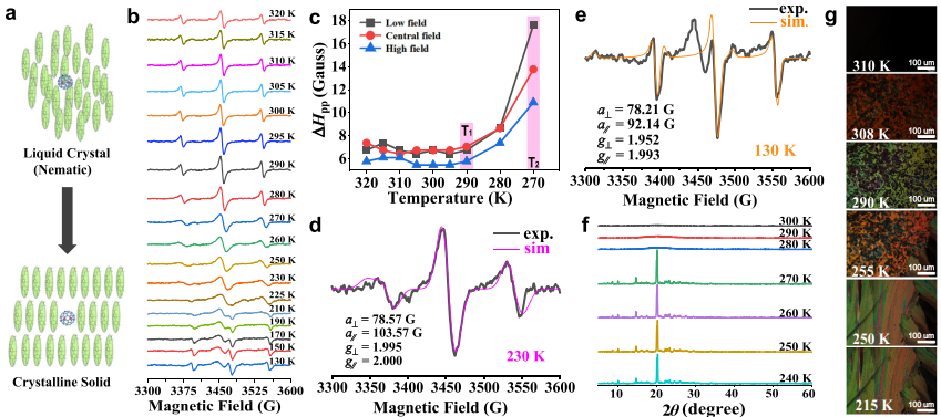 研究采用电子顺磁共振(EPR)作为核心技术,结合变温XRD和偏光显微镜(POM)验证,通过密度泛函理论(DFT)和分子动力学(MD)模拟阐明机制。团队选取1-氯萘和液晶5CB作为模型体系,系统分析了Y2@C79N在相变过程中的EPR信号演变。