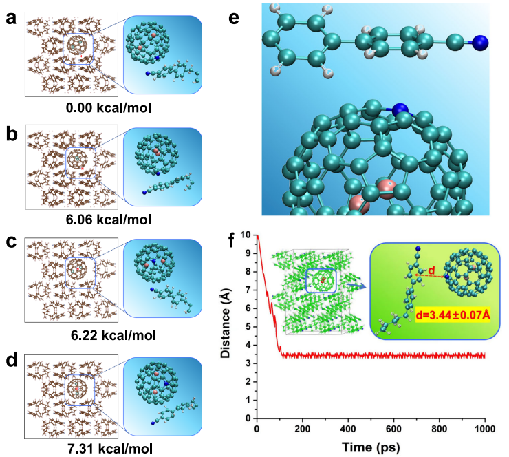DFT优化显示,Y2@C79N的氮原子优先靠近5CB苯环(距离3.44?),