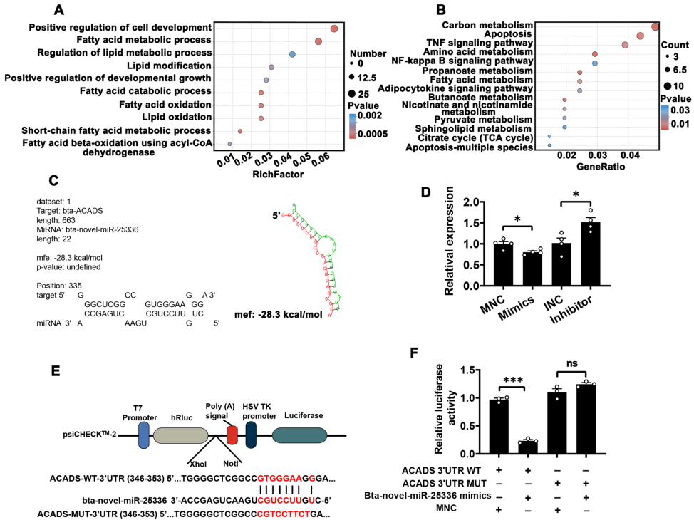 生物信息学预测结合双荧光素酶实验证实,bta-novel-miR-25336通过结合ACADS基因3'UTR抑制其表达。ACADS作为脂肪酸β氧化的限速酶,其下调可减少UFA分解,这与脂肪细胞中SCD等合成酶的上调形成协同效应。