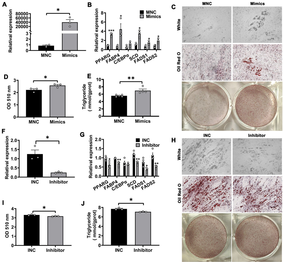 体外实验表明,过表达bta-novel-miR-25336使脂肪标志基因PPARG、FABP4表达提升2-3倍,UFA合成关键酶SCD、FADS2上调1.5-2倍,甘油三酯(TG)积累增加40%。EdU检测显示其促进细胞增殖率达25%。