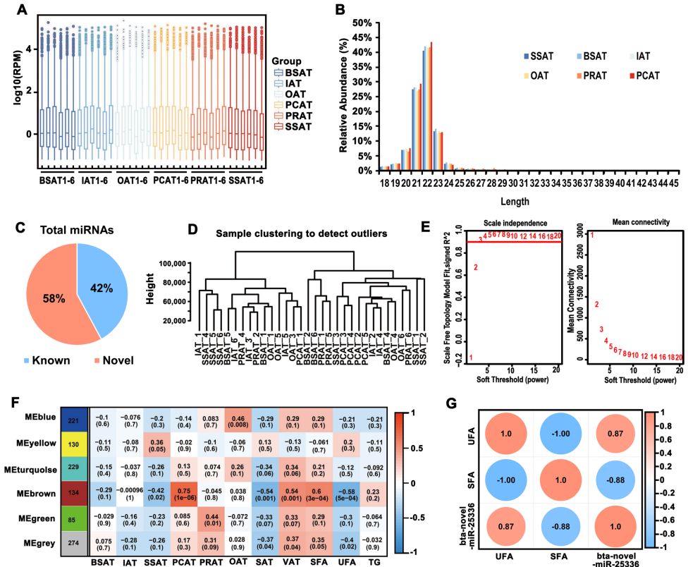 研究团队通过高通量测序鉴定出1682个miRNA(987个为新发现),其中bta-novel-miR-25336在SSAT中表达量最高。WGCNA分析显示该miRNA与UFA含量呈正相关(r=0.87),与饱和脂肪酸(SFA)负相关(r=-0.88)。