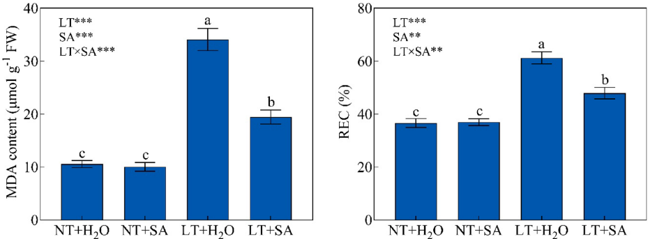 低温使丙二醛(MDA)含量增加3.23倍,相对电导率(REC)升高1.67倍,表明膜系统严重受损。SA处理显著缓解这种损伤,MDA和REC增幅分别控制在1.84倍和1.31倍(图2)。