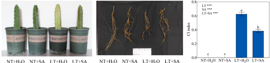 低温胁迫72小时后,未处理组火龙果茎段出现明显黄化萎蔫,根系发育受阻,CI达0.63;而SA预处理组仅表现轻微伤害症状,CI降至0.38(图1)。