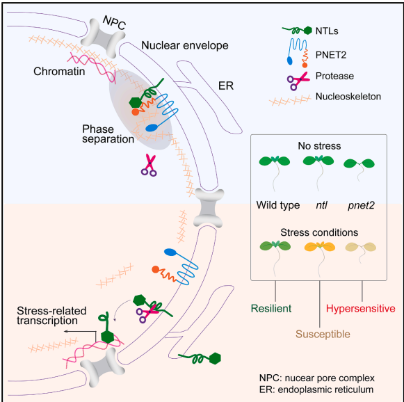 北京大学现代农业研究院和加州大学伯克利分校的研究人员通过系统研究,揭示了植物特有的核膜蛋白PNET2通过液-液相分离(LLPS)调控膜结合NAC转录因子NTLs活性的全新机制。研究发现PNET2与NTLs通过C端内在无序区(IDRs)相互作用,在核纤层形成相分离区室,在正常条件下隔离NTLs并抑制其转录活性;当植物遭遇热胁迫等环境压力时,这种相分离被破坏,释放的NTLs得以激活下游胁迫响应基因。这一发现不仅阐明了植物核纤层调控基因表达的新机制,也为理解植物如何感知和响应环境变化提供了重要线索,相关成果发表在《Developmental Cell》上。