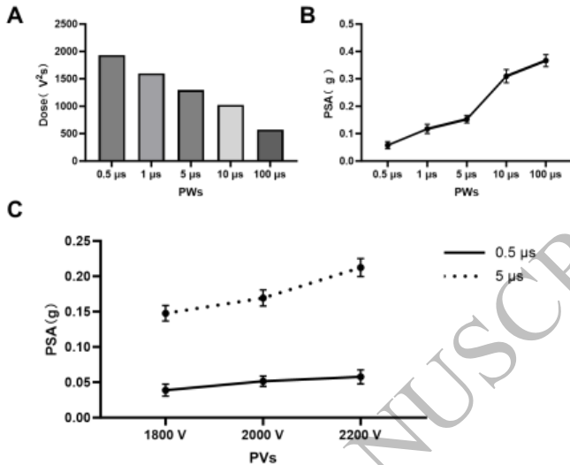 通过公式Dose=(PVolt)2PWn*N量化电刺激剂量,发现脉冲宽度(PW)与电压(PVolt)均正向影响峰值合成加速度(PSA)。关键数据表明:200-1000 ns脉冲在2000-2500 V条件下,PSA值较usPFA(1500-2000 V/1-100 μs)降低40%(p<0.05),证实nsPFA可突破性减轻MCs。