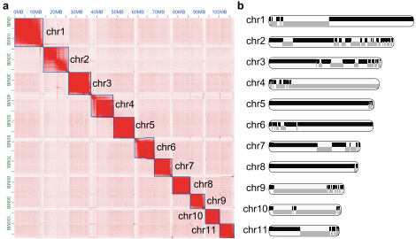 组装获得111 Mb基因组(GC含量31.98%), scaffold N50达10.22 Mb。Hi-C热图验证了染色体结构的准确性