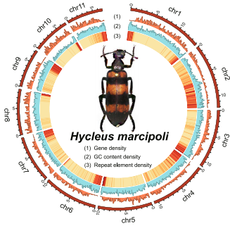 为解决芫菁科害虫基因组资源匮乏问题,研究人员完成了马可波罗芫菁(Hycleus marcipoli)首个染色体级别基因组组装(111 Mb,N50 10.22 Mb),锚定11条染色体并注释13,357个蛋白编码基因。该研究为解析其超变态发育(hypermetamorphosis)相关的嗅觉视觉系统重塑机制及RNAi害虫防控策略提供关键分子基础。