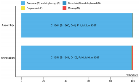 26.43%基因组为重复序列,其中DNA转座元件占比最高(5.41%)。共预测13,357个蛋白编码基因,平均含4.9个外显子,BUSCO完整性达98.8%