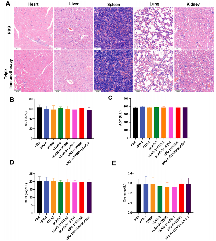 三重免疫治疗展现出显著优势:肿瘤体积从双疗法的208±23 mm3进一步降至53±5 mm3,生存期延长至55天(对照组32天)。机制研究表明,该方案使CD8+/Treg比值提高4倍,IFN-γ分泌增加2.3倍,同时H&E染色显示广泛坏死区域。安全性评估显示主要器官无病理损伤,肝肾功能指标(ALT/AST/BUN/Cre)均在正常范围。