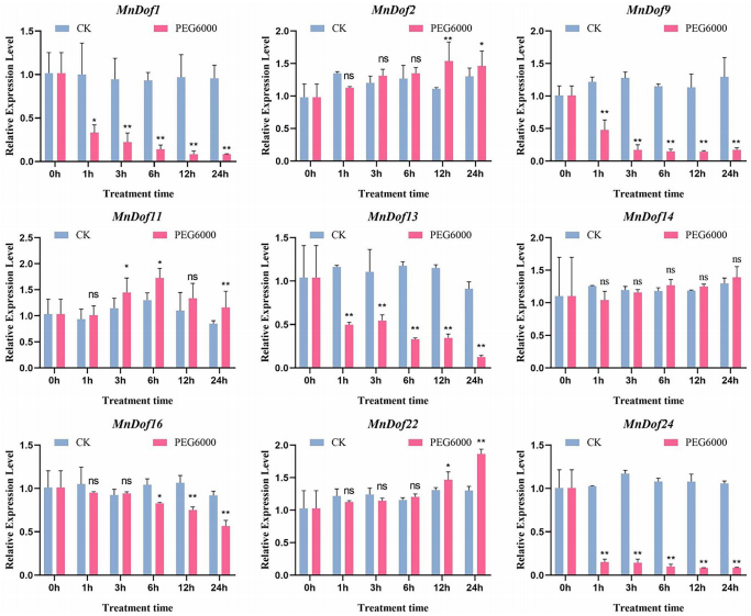 干旱响应验证:qRT-PCR显示MnDof2/22显著上调,MnDof1/24下调(P<0.05),其中MnDof22启动子含3个DRE元件,可能作为抗旱分子标记。