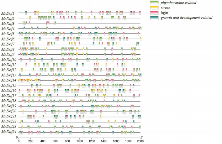 基因特征分析:24个MnDof蛋白均含典型C2-C2锌指结构(Motif1),分子量18.69-59.01 kDa,等电点5.04-9.4,全部定位于细胞核。启动子分析发现401个激素响应元件(含162个茉莉酸甲酯MeJA元件)和144个胁迫响应元件(如干旱响应元件DRE)。