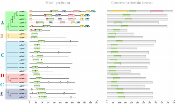 进化与结构:与拟南芥、水稻等物种的Dof蛋白聚类显示,MnDof分为5个亚组(Group I-V),其中Group V特有的C端富含脯氨酸/谷氨酰胺重复序列(如Motif8: P-Q-P-Q),暗示其可能参与蛋白互作。