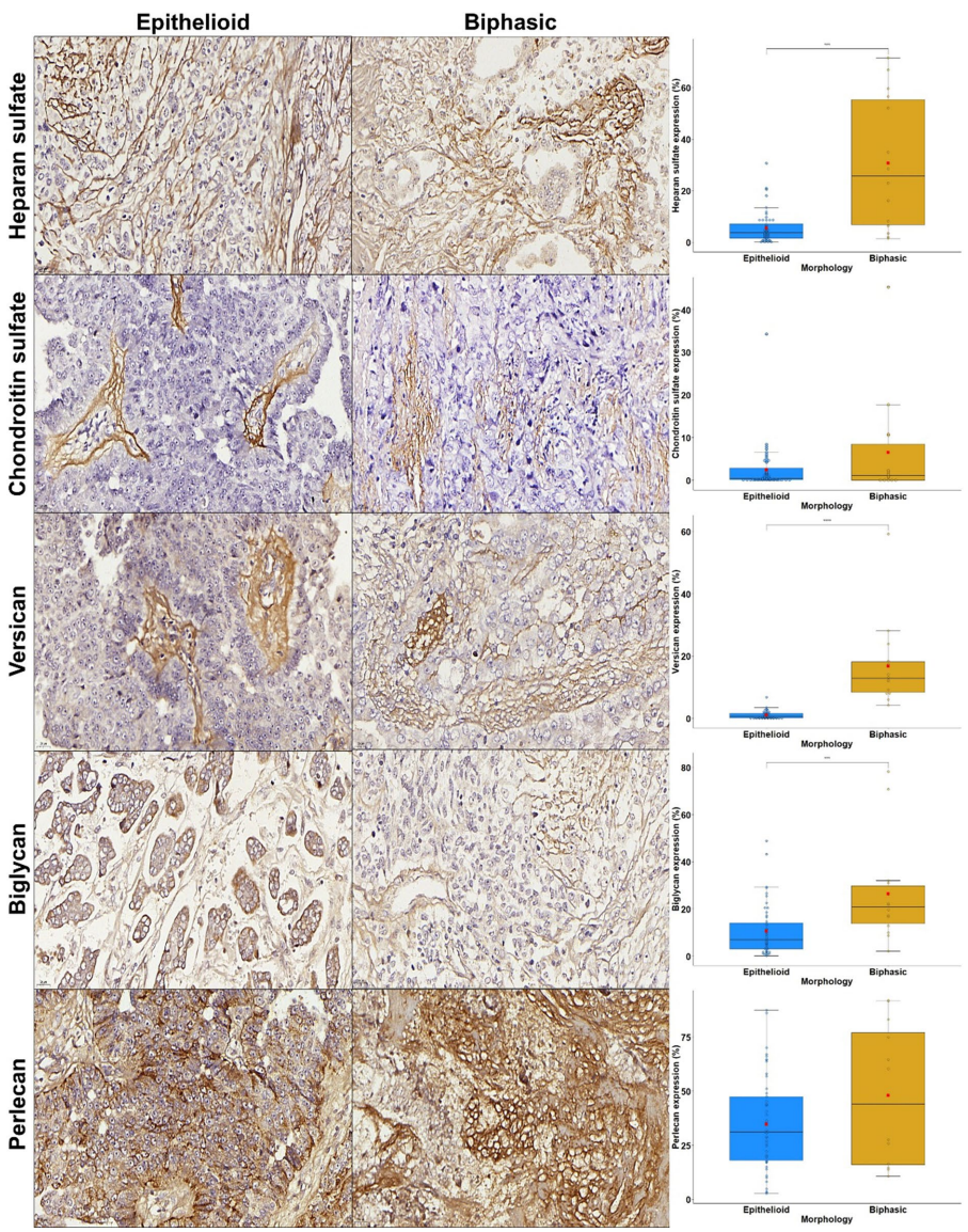 研究团队在《Glycoconjugate Journal》发表的研究中,创新性地提出ECM中GAGs/PGs网络可能是调控MPM表型可塑性的关键开关。通过构建包含66例B-MPM样本的组织微阵列(TMA),采用免疫组化结合QuPath数字病理分析技术,系统检测了硫酸乙酰肝素(HS)、硫酸软骨素(CS)以及versican、biglycan、perlecan等PGs的表达特征。研究特别关注了这些分子与临床病理参数、ECM纤维密度以及患者预后的多维关联。