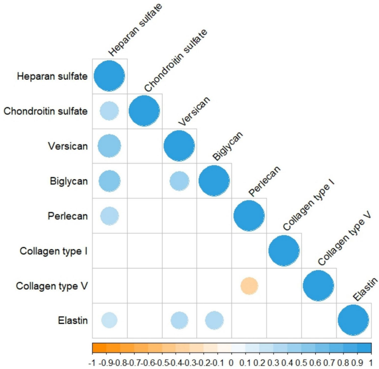 微环境互作:HS高表达与肿瘤坏死显著相关(P=0.016),versican和biglycan则与弹性纤维密度呈正相关(P<0.01)。Spearman分析显示HS与versican(ρ=0.569)、biglycan(ρ=0.501)存在协同表达。