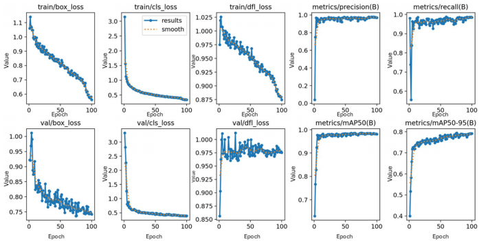 训练过程显示模型在100轮训练后达到稳定状态,各类损失函数持续下降。F1-置信度曲线分析确定0.666为最佳置信阈值,此时F1-score达0.97。模型在测试集上表现出色:mAP@0.5达0.982,mAP@0.5:0.95为0.803。分类准确率方面,股骨(98%)、下颌骨(97%)、耻骨(96%)和头骨(100%)均保持高识别率,但存在将背景误判为股骨的现象(48%假阳性)。