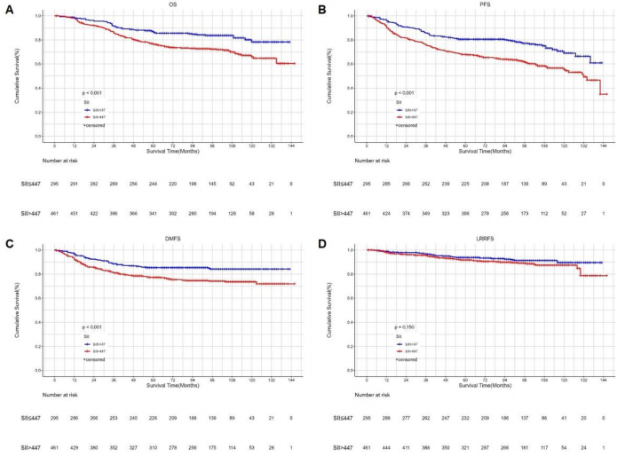 SII和LDH均是OS(SII:HR=1.605,p=0.005;LDH:HR=1.810,p<0.001)、DMFS(SII:HR=1.600,p=0.001;LDH:HR=1.678,p<0.001)和PFS(SII:HR=1.600,p=0.001;LDH:HR=1.678,p<0.001)的独立预测因子,但对局部区域无复发生存(LRRFS)无显著影响。