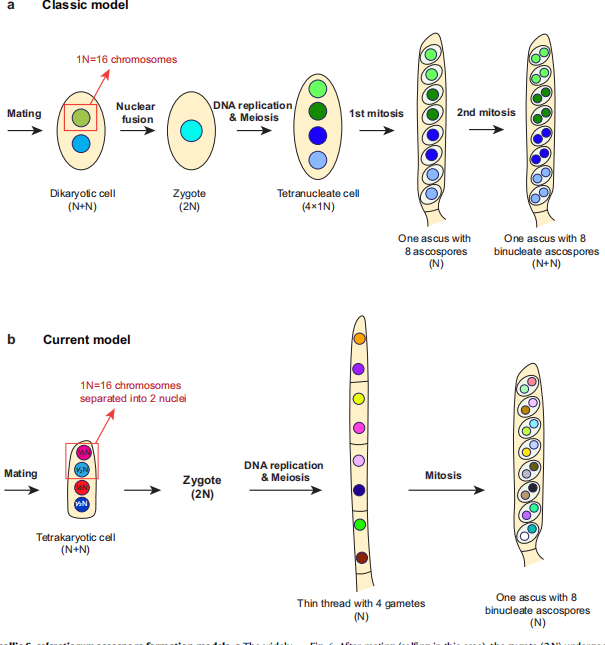 这项研究颠覆了人们对真菌减数分裂的传统认知。尽管核盘菌将单倍体染色体组分配到两个核中,却能完成正常的减数分裂,这可能是通过两个核的紧密协同实现的。研究提出的新型子囊孢子发育模型(图7b)与传统"一个核一个基因组"模型(图7a)形成鲜明对比。