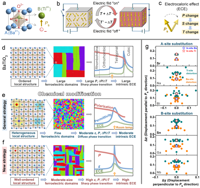 随着全球气候变化加剧,开发环境友好型制冷技术迫在眉睫。传统蒸汽压缩制冷系统因温室气体排放问题面临淘汰,而基于电卡效应(Electrocaloric Effect, EC)的固态制冷技术因其零排放、高效率等优势成为研究热点。铁电材料作为EC效应的核心载体,其性能提升面临两大瓶颈:室温工作区间与高本征响应难以兼得。以BaTiO3(BT)为代表的铁电体虽在居里温度(TC≈120°C)附近表现出强EC效应,但室温下因稳定铁电相导致极化变化率(?P/?T)骤降;而常规化学改性虽可调节TC至室温,却以牺牲长程有序结构为代价,导致本征EC效应弱化。