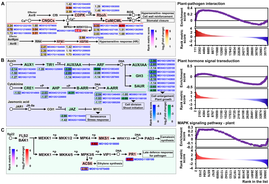 转录调控网络:RNA-Seq鉴定到4492个差异基因,其中植物-病原互作通路显著富集。研究发现Rvi6可能通过类似番茄Cf-9的CDPK-Rboh-ROS途径激活抗性,同时上调Ca2+-CNGCs(环核苷酸门控通道)介导的WRKY33-PR1信号级联。