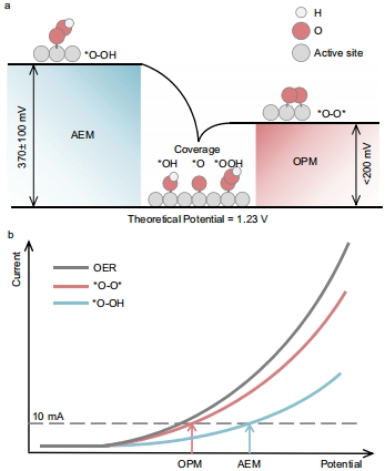 在绿色能源技术蓬勃发展的今天,析氧反应(Oxygen Evolution Reaction, OER)作为电解水制氢、CO2还原等关键电催化过程的阳极反应,其缓慢的动力学过程和高过电位已成为制约能源转换效率的瓶颈。传统研究认为,吸附氧(O)作为OER的关键中间体,其转化路径主要包括吸附物演化机制(Adsorbate Evolution Mechanism, AEM)和氧化物路径机制(Oxide Path Mechanism, OPM),但不同O转化路径对过电位的具体贡献始终未能明确。Zhixuan Chen等研究者发表在《Nature Communications》的工作,通过创新性技术手段揭开了这一"黑箱"之谜。