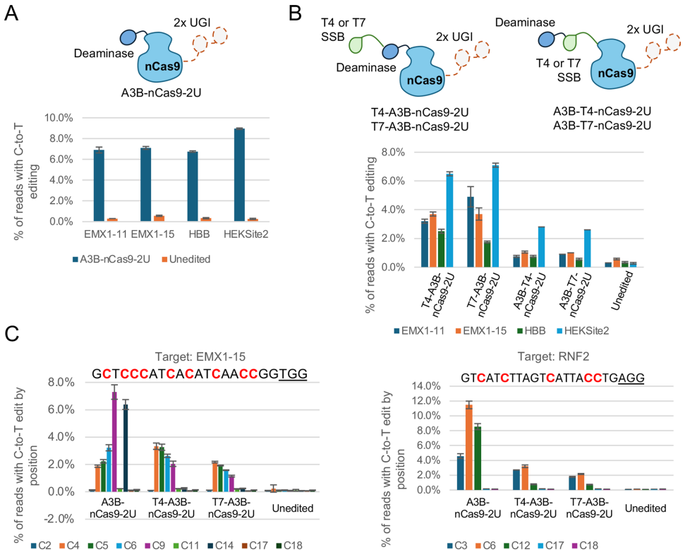 为突破这些限制,Erin Brettmann团队在《BMC Biotechnology》发表研究,开发了两种创新性CBE蛋白。研究人员采用大肠杆菌表达系统,通过FPLC纯化获得高纯度蛋白,结合体外编辑实验、深度测序分析和细胞模型验证,系统评估了编辑特性。关键技术包括:噬菌体SSB结构域融合工程、UGI共递送优化、PEXBUFF转染增强剂应用,以及基于MiSeq平台的NGS分析。
