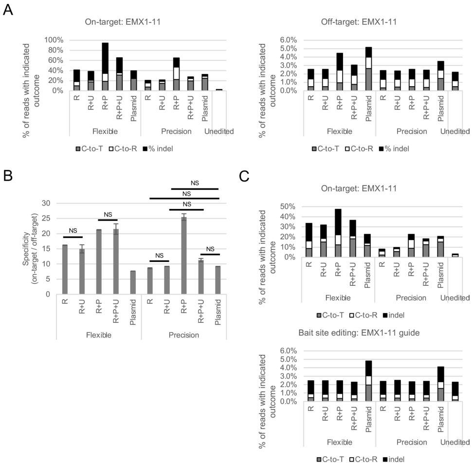 RNP格式相比质粒递送展现出显著优势:在EMX1-11错配靶点,质粒组产生8.7%脱靶编辑,而RNP组仅0.3%;正交R-loop实验证实RNP可完全避免向导非依赖的全基因组脱靶编辑。转染增强剂PEXBUFF使编辑效率提升3倍,且与UGI具有协同效应。